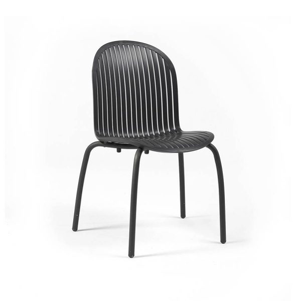 Silla de una sola pieza sin brazos de resina de fibra de vidrio con formas acogedoras y relajantes. Patas de aluminio barnizado y curvado que recuerdan las dinámicas naturales de las flores acuáticas