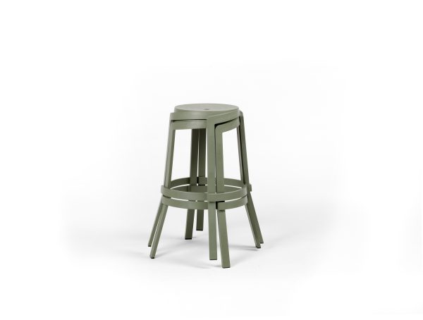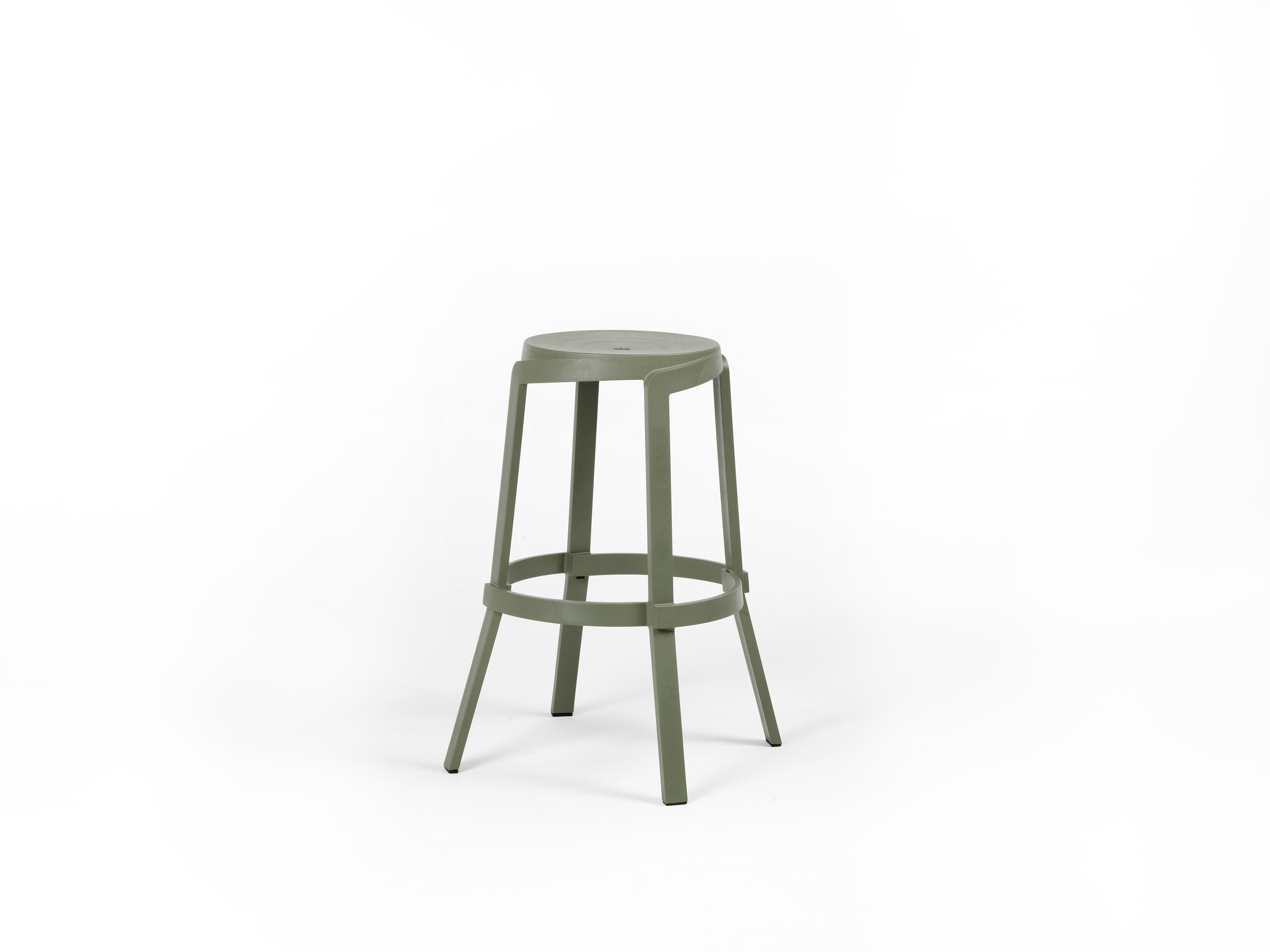 Material: polipropileno fiberglass regenerado tratado anti-UV y teñido en masa. Efecto mate. Con tapones antideslizantes. Apilable. Altura asiento 76,5 cm. Resina reciclable.